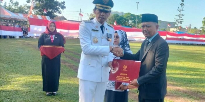 Usai pimpin upacara HUT Kemerdekaan RI ke-80, Bupati Gusril menyerahkan penghargaan Satyalancana Karya Satya 30 tahun, 20 tahun dan 10 tahun dari Presiden RI kepada tiga orang ASN di Pemkab Kaur.