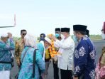 Bengkulu- Rombongan jamaah haji tergabung kelompok terbang (kloter) I asal Bengkulu, tiba di Bandara Fatmawati Seokarno disambut langsung oleh Gubernur Bengkulu Rohidin